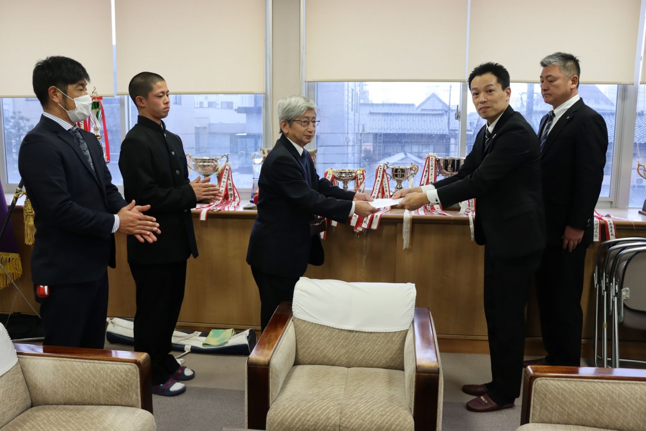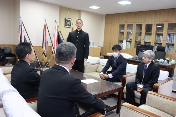 サンソン建設株式会社 代表取締役 成山 隆盛様からは、母校である本校野球部の活動環境向上に役立ててほしいとの思いを込めて、今回の寄贈をご意向いただきました。また、贈呈の場では、野球部主将の松浦 克典君から、今後の高い目標に向けた決意とともに、今回のご支援への感謝の気持ちが述べられました。