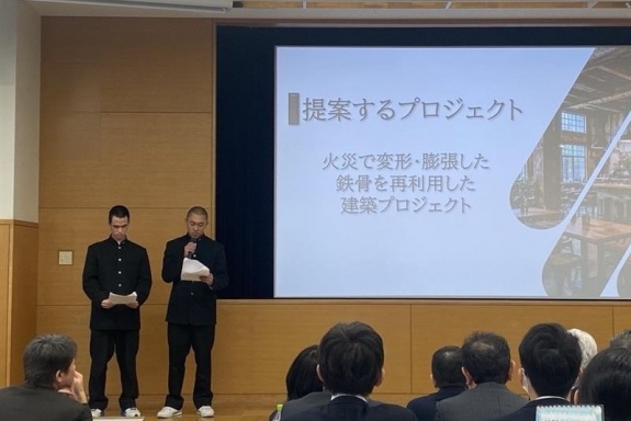 「コウノトリ」のメンバーは、鈴木 啓心さん、山崎 優太さん、南部 理佳さん、高橋 未央那さん、齊藤 佑衣さんの5名。鴻池組のインターンとして、「『自然と人がとけあう』社会へと革新する鴻池組の未来プロジェクトを提案せよ!」というミッションに対し、「燃えた先に、未来を」というタイトルで、火災に見舞われて生じた廃材を再利用し、また新たな建物を建築するというプロジェクトを提案しました。