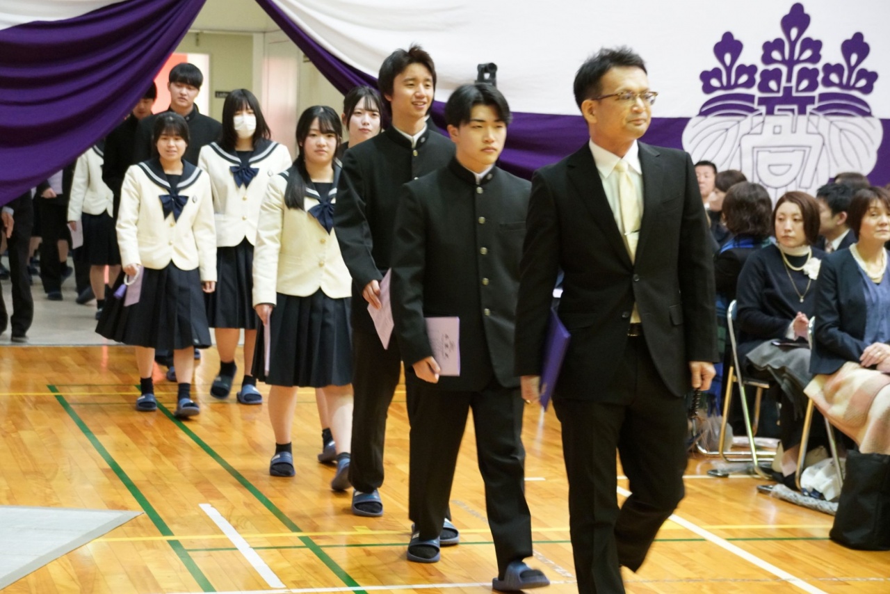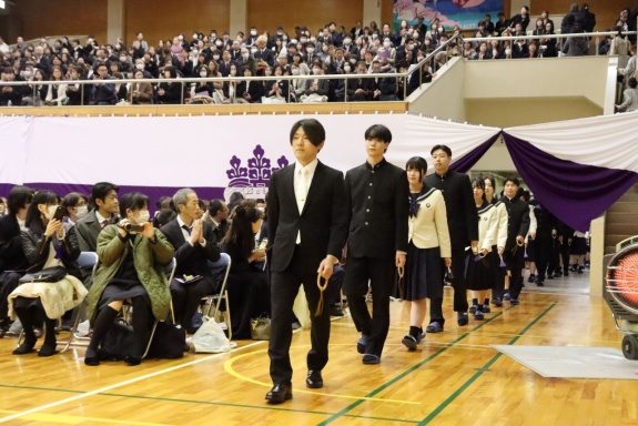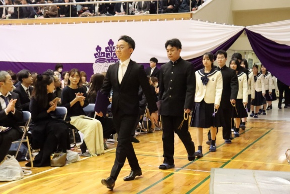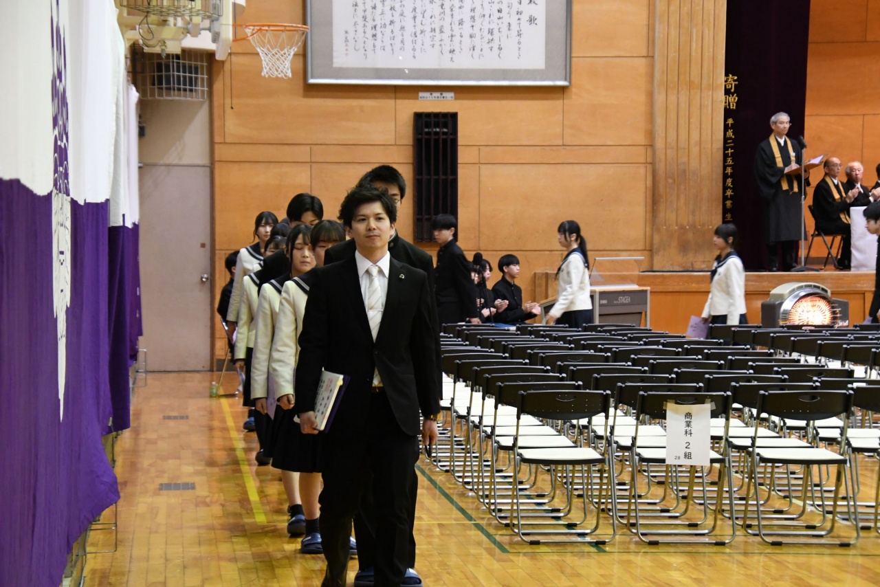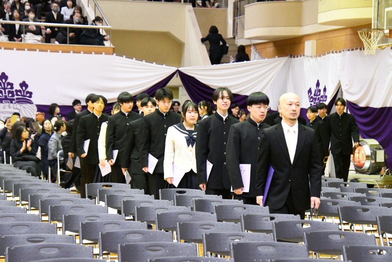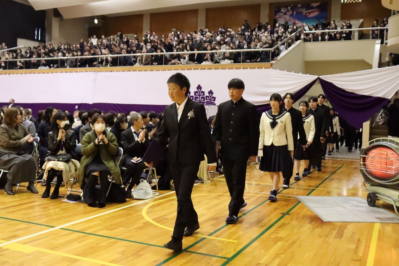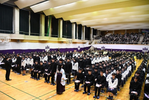 3月3日(火)、本校では令和7年度卒業式を挙行し、厳かな雰囲気のなか462名の卒業生が学び舎を巣立っていきました。普通科第78回405名、商業科第70回57名の生徒たちが、それぞれの進路へ向けて新たな一歩を踏み出す記念すべき日となりました。多くの保護者の皆様に加え、来賓の方々にもご臨席いただき、心温まる祝辞や励ましの言葉を頂戴しました。皆様の温かなまなざしのもと、卒業証書授与をはじめとする式次第は滞りなく進み、式場には静かな緊張感と生徒たちの成長を感じ取る空気が満ちていました。また、卒業生が真摯な態度で式に臨む姿は、これまでの学校生活で培われた責任感や自立心を強く感じさせるもので、参列した人々に深い印象を残しました。その一人ひとりの姿が、節目の式典にふさわしい重みと感動を生み出し、会場全体が引き締まった雰囲気に包まれる卒業式となりました。