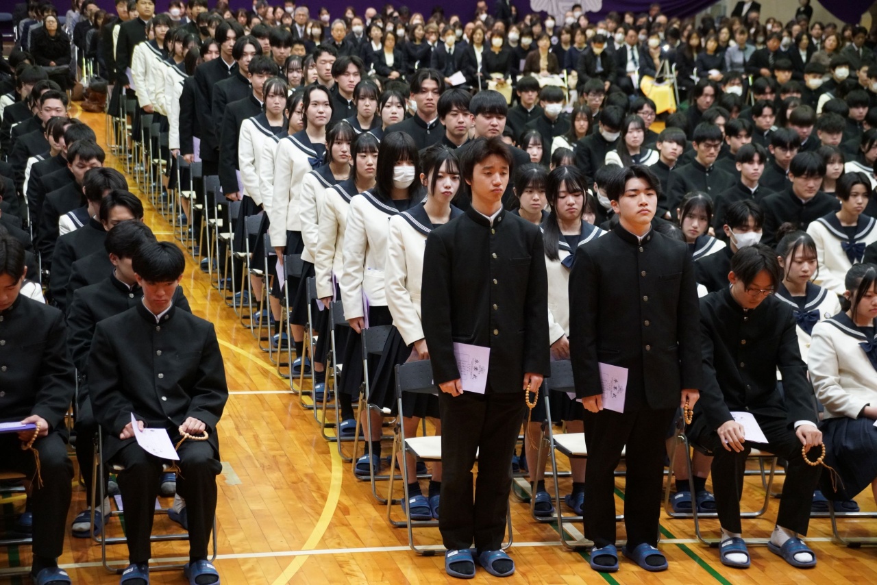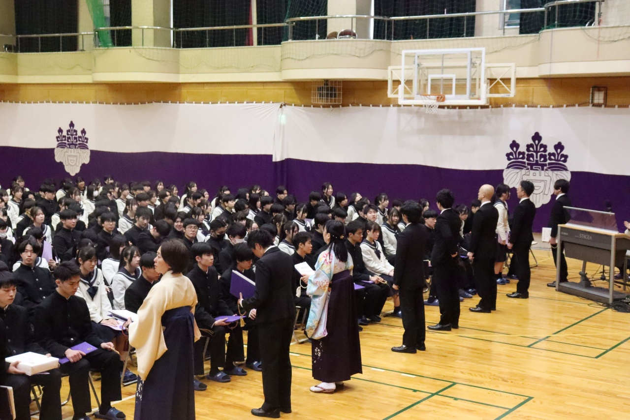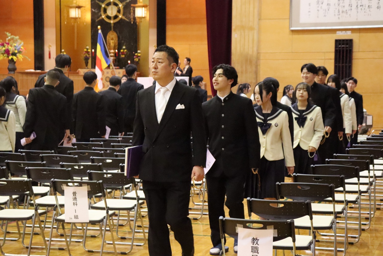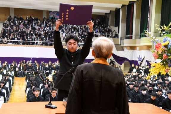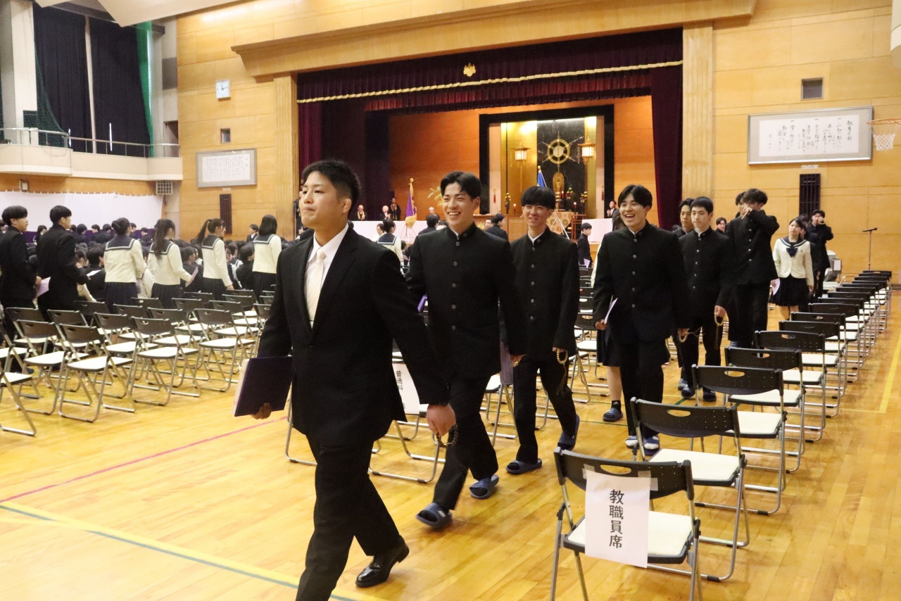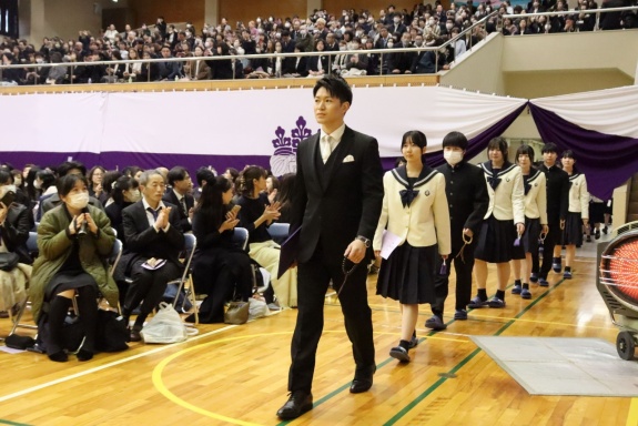 3月3日(火)、本校では令和7年度卒業式を挙行し、厳かな雰囲気のなか462名の卒業生が学び舎を巣立っていきました。普通科第78回405名、商業科第70回57名の生徒たちが、それぞれの進路へ向けて新たな一歩を踏み出す記念すべき日となりました。多くの保護者の皆様に加え、来賓の方々にもご臨席いただき、心温まる祝辞や励ましの言葉を頂戴しました。皆様の温かなまなざしのもと、卒業証書授与をはじめとする式次第は滞りなく進み、式場には静かな緊張感と生徒たちの成長を感じ取る空気が満ちていました。また、卒業生が真摯な態度で式に臨む姿は、これまでの学校生活で培われた責任感や自立心を強く感じさせるもので、参列した人々に深い印象を残しました。その一人ひとりの姿が、節目の式典にふさわしい重みと感動を生み出し、会場全体が引き締まった雰囲気に包まれる卒業式となりました。