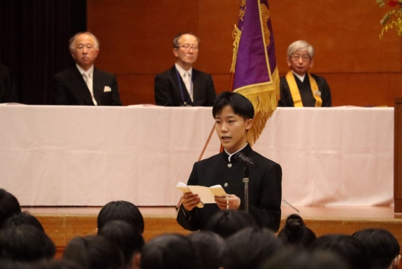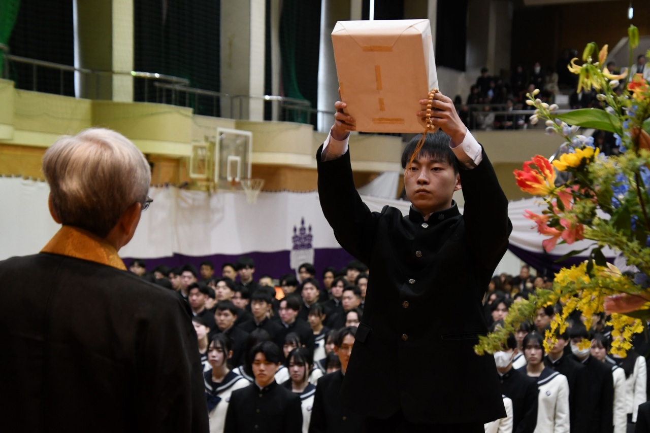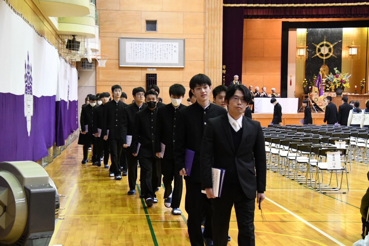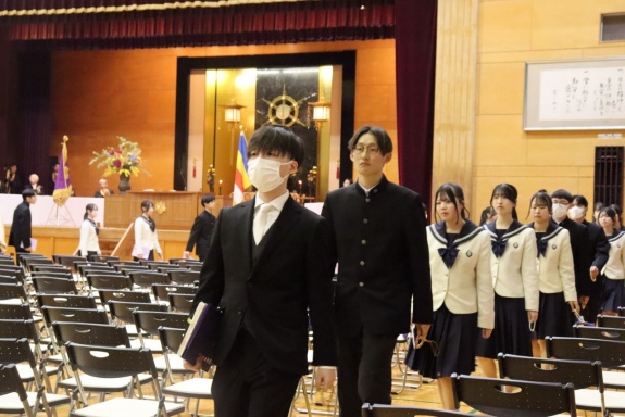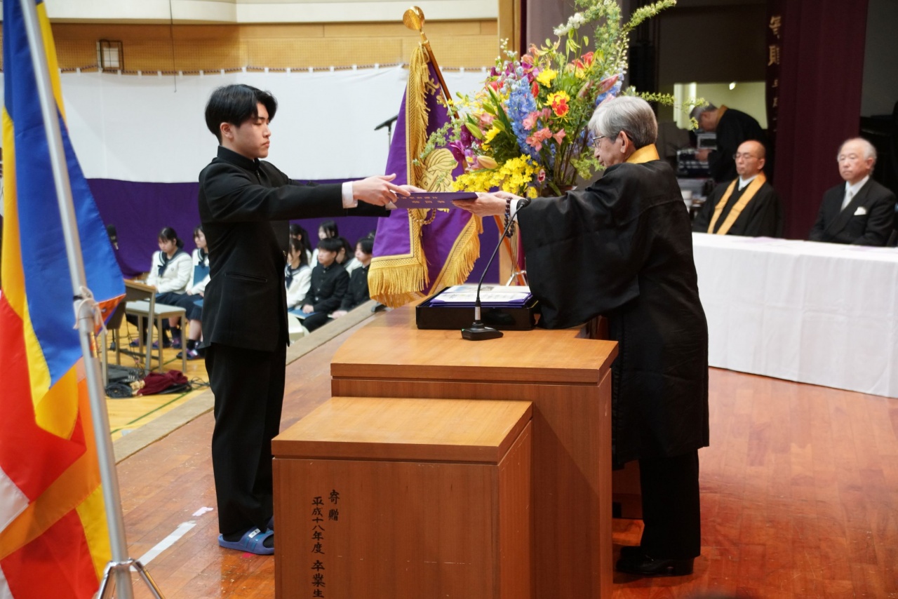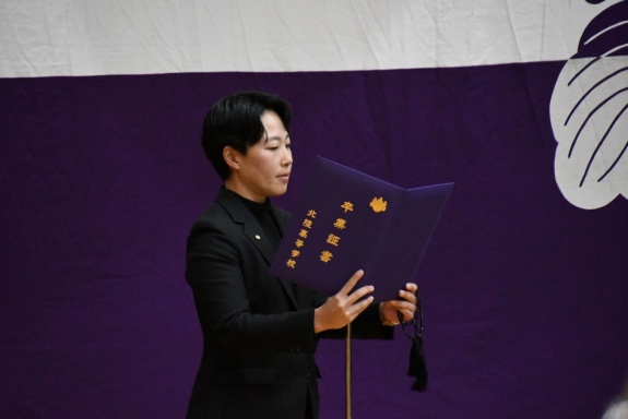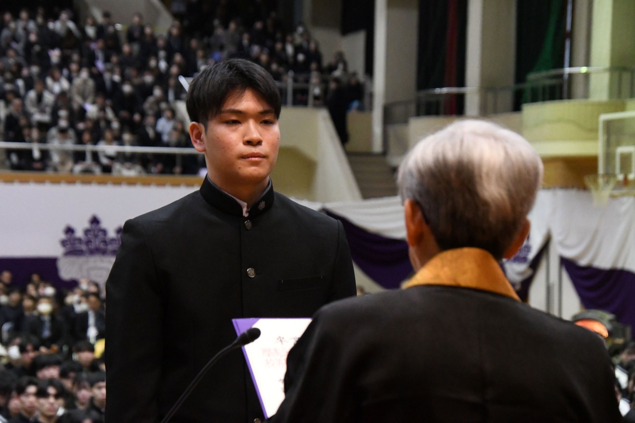 3月3日(火)、本校では令和7年度卒業式を挙行し、厳かな雰囲気のなか462名の卒業生が学び舎を巣立っていきました。普通科第78回405名、商業科第70回57名の生徒たちが、それぞれの進路へ向けて新たな一歩を踏み出す記念すべき日となりました。多くの保護者の皆様に加え、来賓の方々にもご臨席いただき、心温まる祝辞や励ましの言葉を頂戴しました。皆様の温かなまなざしのもと、卒業証書授与をはじめとする式次第は滞りなく進み、式場には静かな緊張感と生徒たちの成長を感じ取る空気が満ちていました。また、卒業生が真摯な態度で式に臨む姿は、これまでの学校生活で培われた責任感や自立心を強く感じさせるもので、参列した人々に深い印象を残しました。その一人ひとりの姿が、節目の式典にふさわしい重みと感動を生み出し、会場全体が引き締まった雰囲気に包まれる卒業式となりました。
